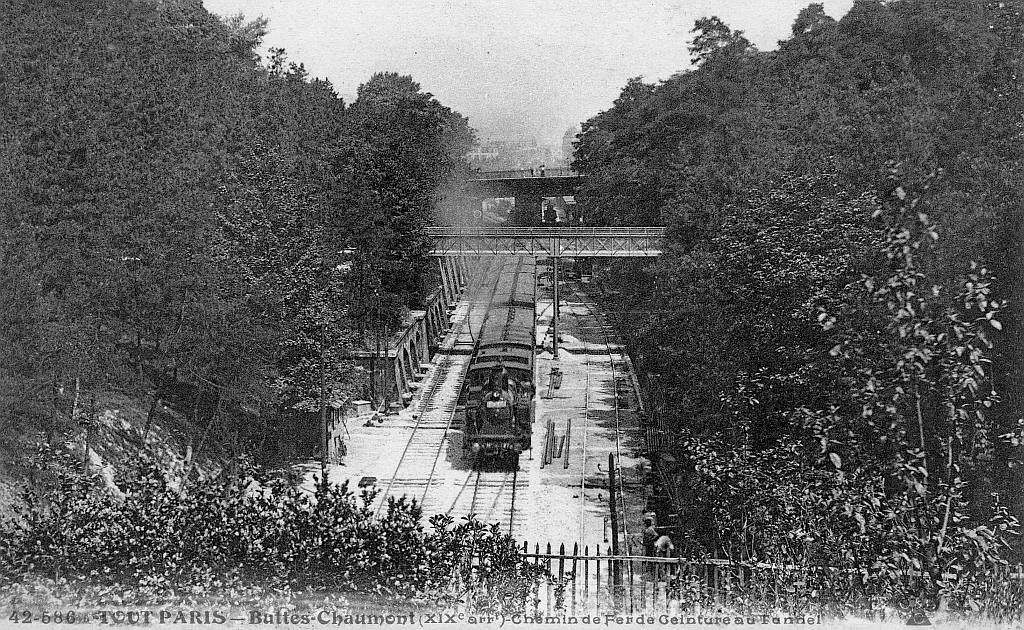 Mais c’est surtout l’intégration de la Petite Ceinture au parc qui révèle au grand jour ce mariage de la nature et de technique, et la subordination de la première à la seconde. En effet, la Petite Ceinture, ou le « chemin de fer de ceinture » comme on l’appelle à l’époque, traverse le terrain acheté par la ville pour construire les Buttes-Chaumont. Construite une dizaine d’années auparavant, les rails sont intégrés au parc, qu’ils traversent enfoncés dans une tranchée. Une guinguette, le « chalet du chemin de fer » surplombe cette tranchée et offre ainsi aux parisiens la possibilité de regarder les trains passer.